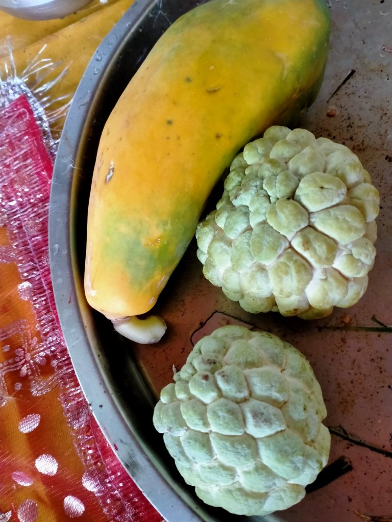 We started to study the ayurvedic plants and dry them to make herbal tea and powders. We had the first papayas and Sita fruit (see on the plate below). The red flowers are opening generously these days of rainy season. Divine Mother is happy!