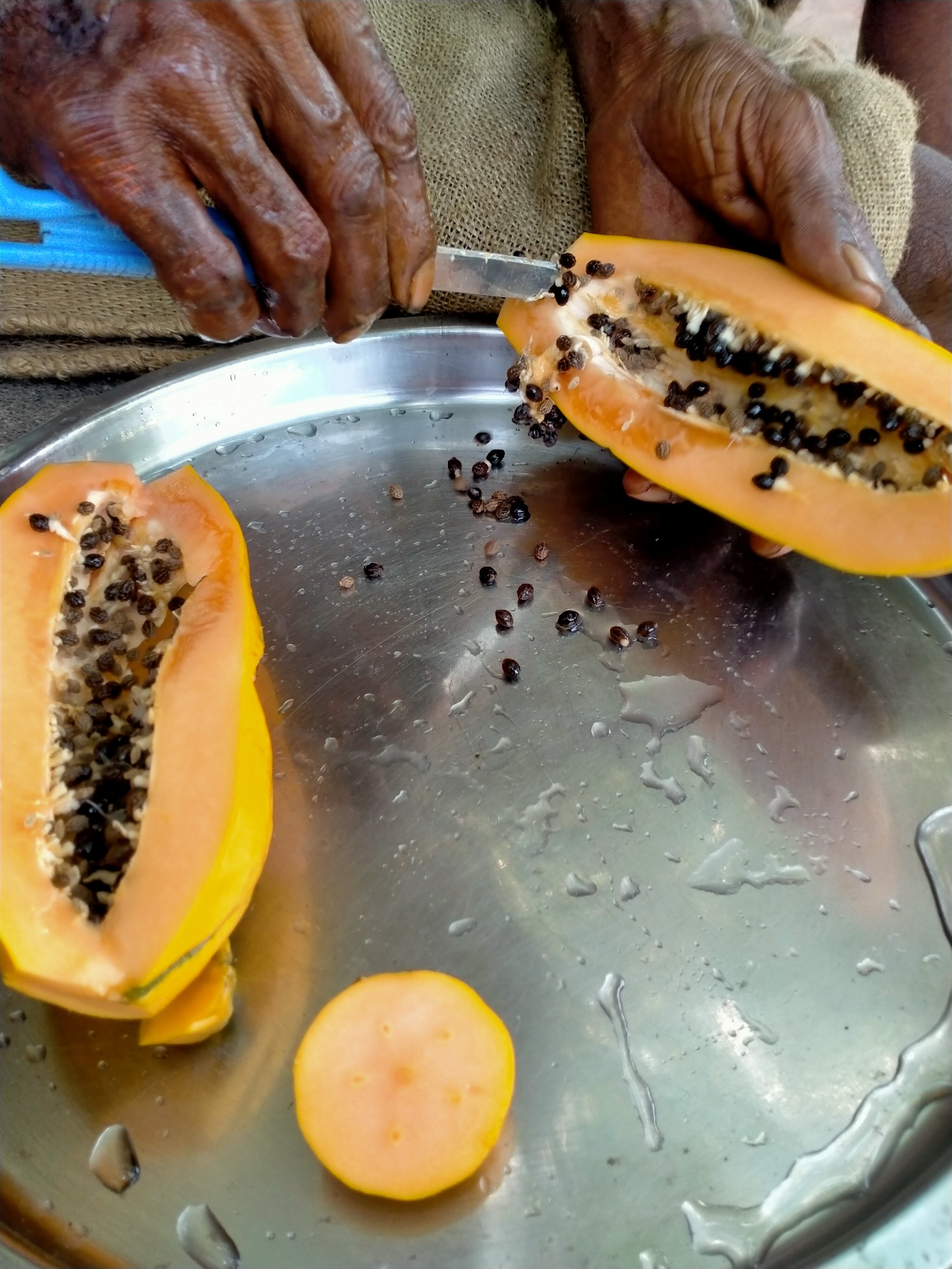 In the evening we cook on the stove and I am learning new recipes. We give food to the deities then enjoy it ourselves. It’s a blessed moment ! We already ate some fruits & vegetables from the garden like the green and pink papaya or this fruits called Sita fruit. If it’s not too late and if the lions are not too far, then we finish all the cleaning in the evening/night – if not, early morning. Crickets, frogs, birds make a sweet melody we listen throughout the night when we meditate near the fire or before sleep.