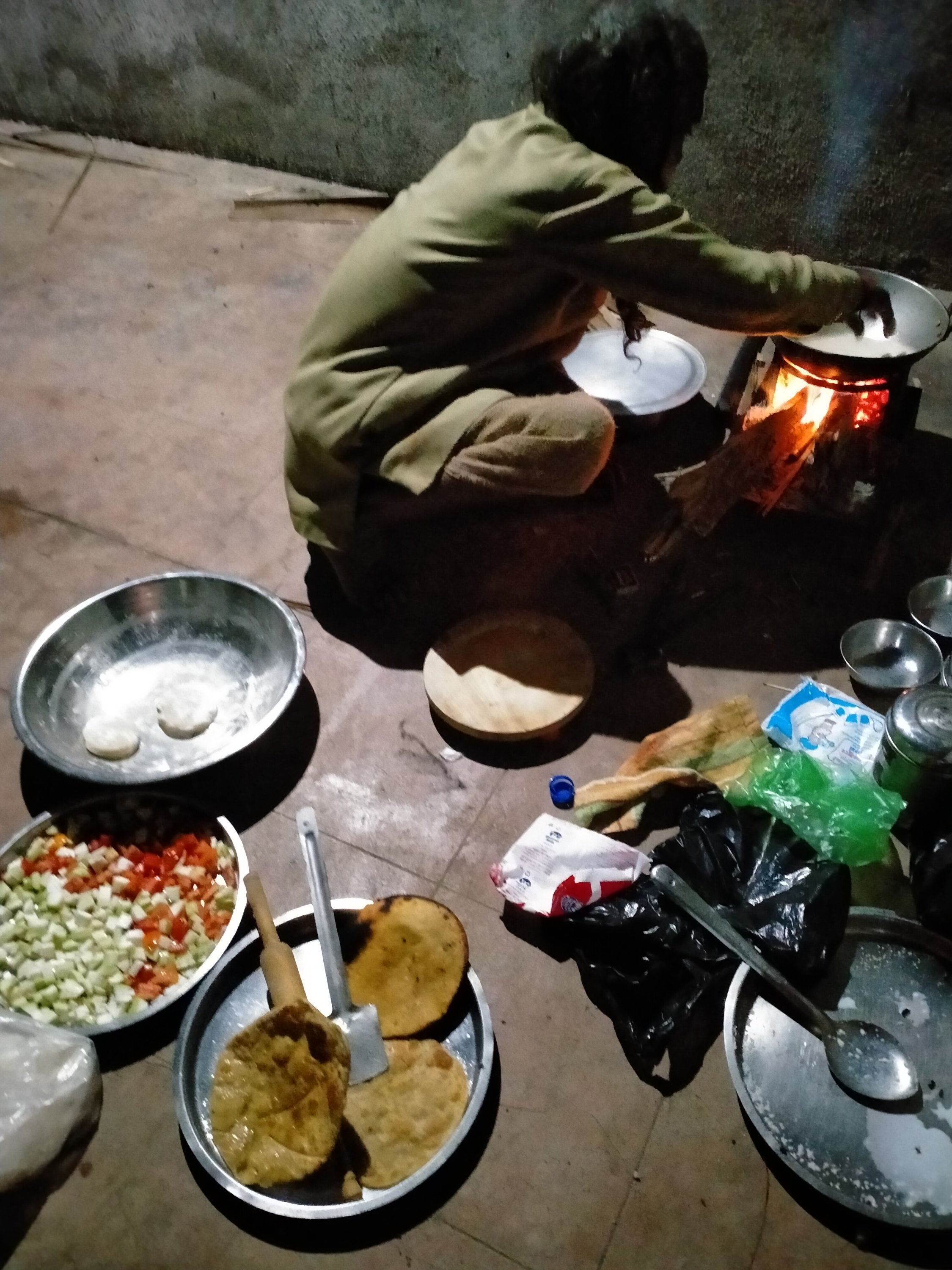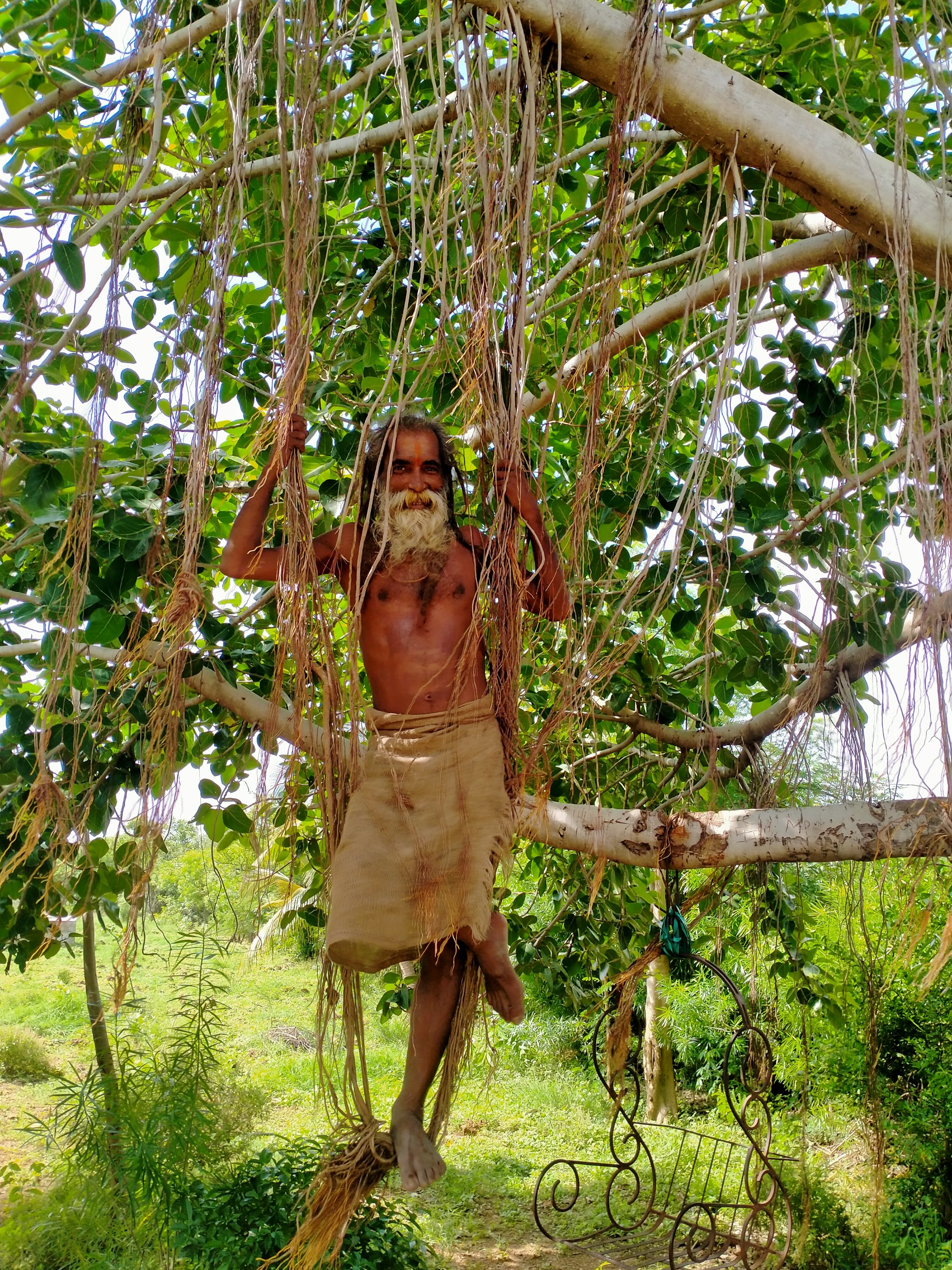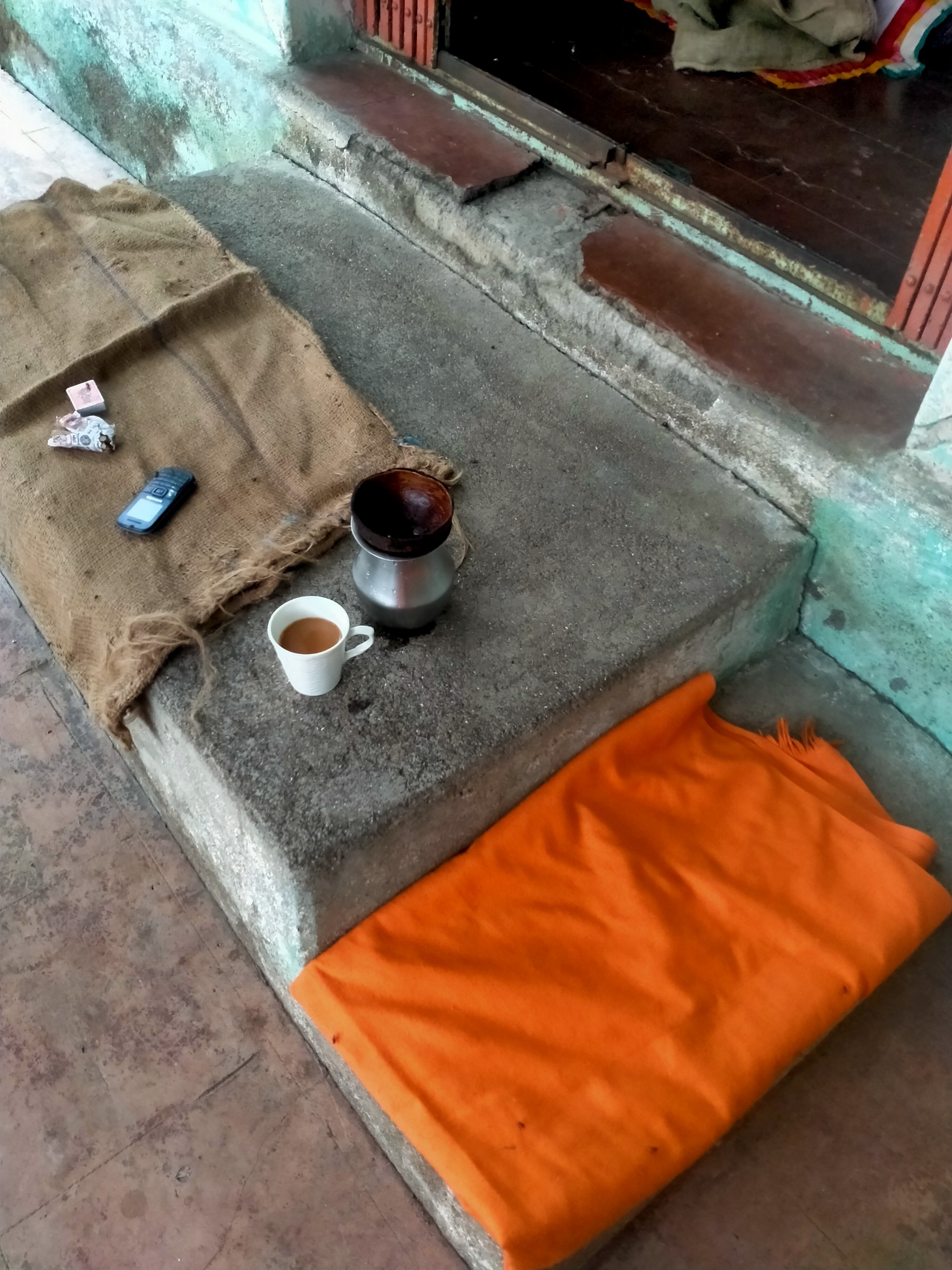 Later, during the day, many villagers are coming to pray and spend time with the old sage. They are smoking a local cigarette in old style. If there are no women coming, usually I stay in my room studying or I have courses online at that time. Only if we sing I come out & sing with them or make them listen to Guruji’s bhajans.